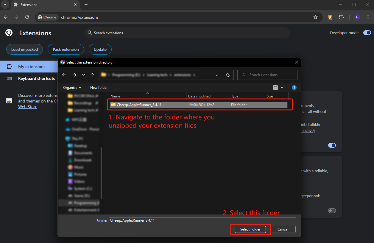 Let’s now click on Load unpacked and navigate to the folder where you unzipped your extension files. Select the folder and confirm to load the extension into Chrome.